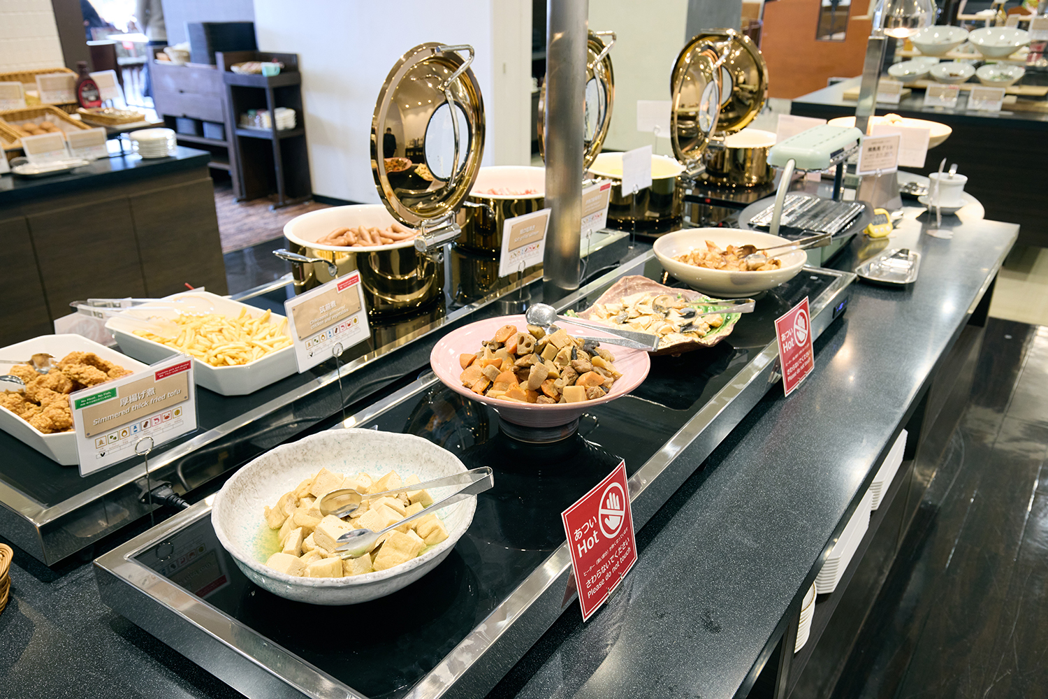 ホットウォーマーを設置していますのでいつでも温かいお料理を召し上がっていただけます。福井の郷土料理「厚揚げ煮」もあったかいですよ。